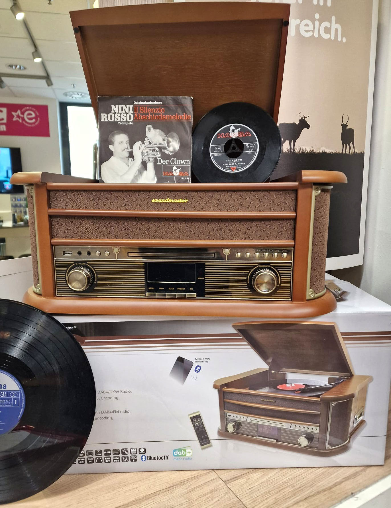 Ein Soundmaster Plattenspieler im Retro-Look aus Holz mit einem geöffneten Deckel, der ein Schallplattenspieler-Fach enthüllt.